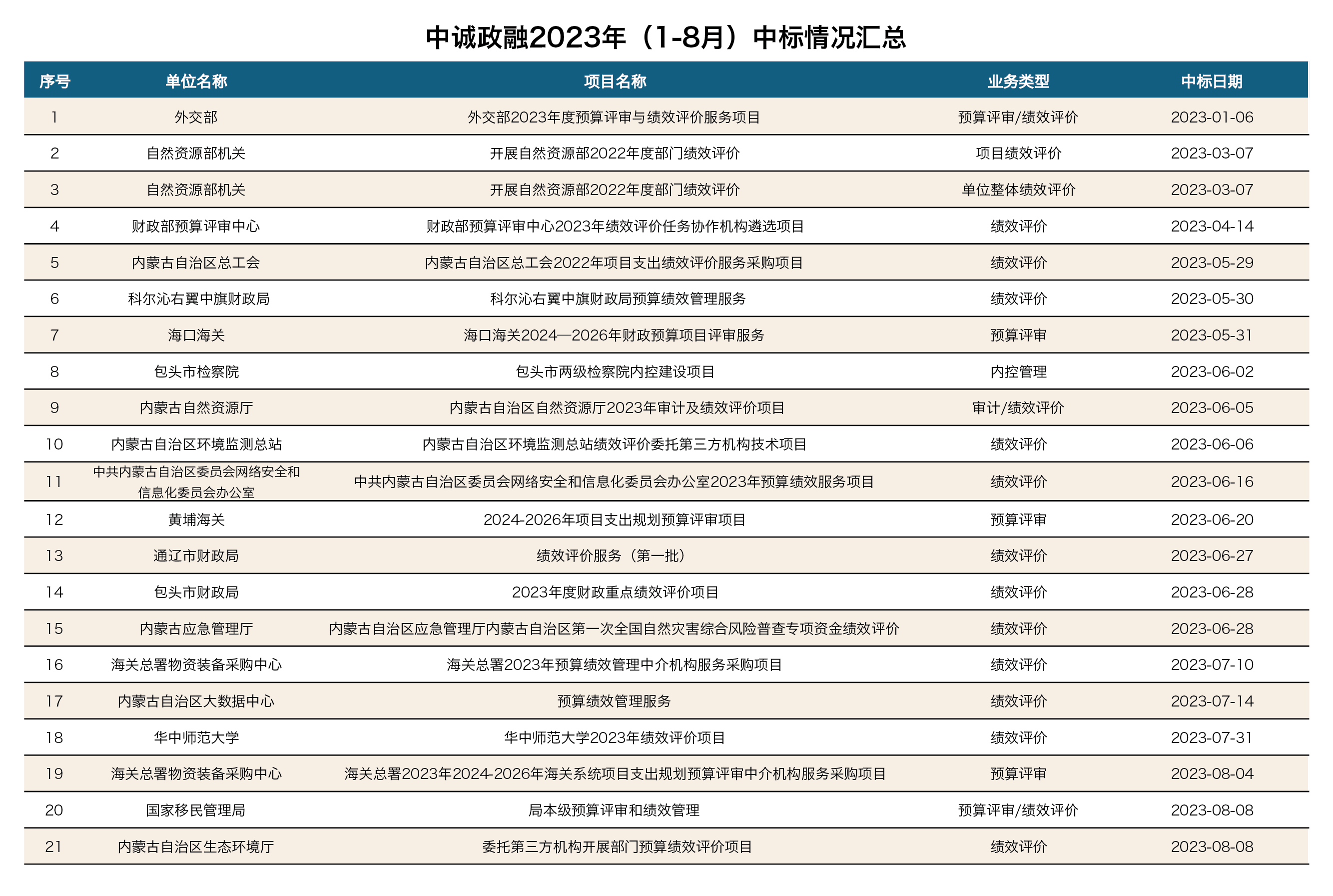 2023年上半年已经过去,根据统计1-8月我司中标项目共21个,服务对象包括外交部、财政部预算评审中心、移民局、海关总署等国家部委及政府事业单位,同时也逐步拓展到内蒙古自治区总工会、包头市检察院、通辽市财政厅等地方政府部门,项目类型稳中有延,覆盖预算评审、绩效评价、单位整体评价、审计及内控建设等多个财政相关咨询领域,为企业的市场开拓和企业布局升级发展迈进了坚实的一步。
